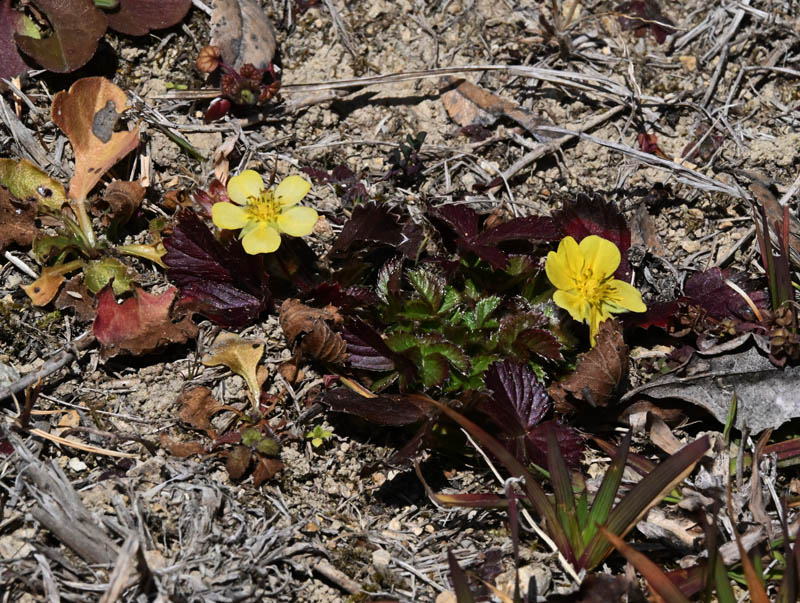 キジムシロ 地面の土が見えている畑の法面に咲く。 辺りに何も花がないなかでは、小さな花二つでも結構よく目立つ。 〔兵庫県東播磨:2026年2月17日撮影〕 |