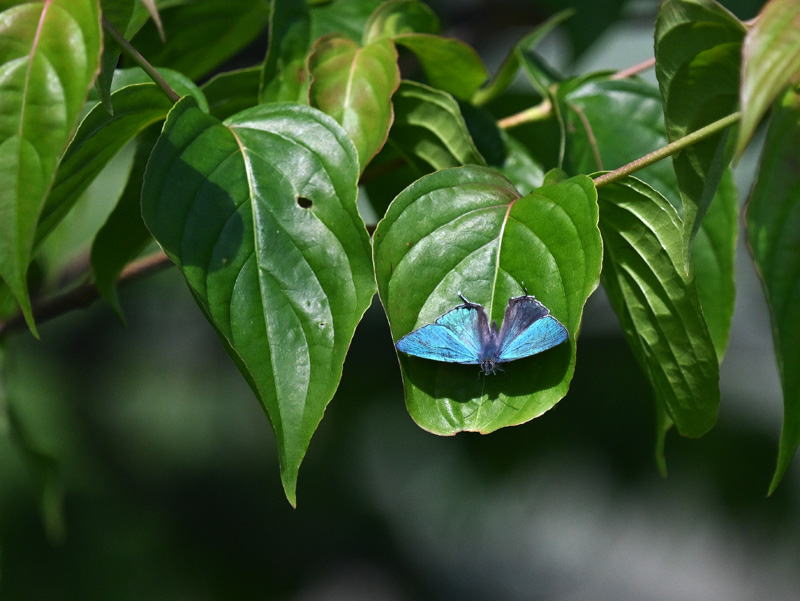 オオミドリシジミ Favonius orientalis ヤマボウシの葉先で占有行動中のオス。 同種のオスが目前を通過するとすかさず飛び立ち後を追う。 羽化後やや時間が経っているようで翅表の鱗粉が剥落し始めている。 2025年7月 兵庫県但馬 |