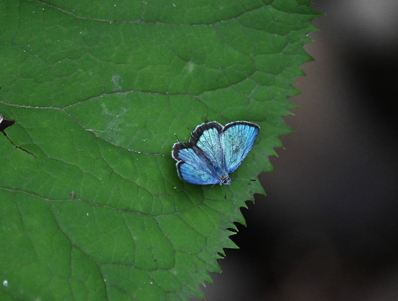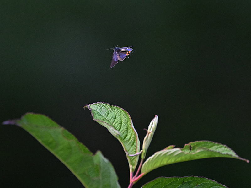 キマダラルリツバメ 占有行動中、近づく他のオスに反応し飛び立つオス。 陽が傾く午後4時半頃から、ハヤシミドリシジミとともに本種の活動も始まる。 【兵庫県但馬:2025年7月1日撮影】 |
