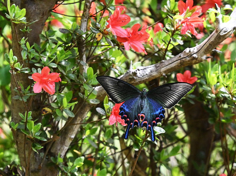 オナガアゲハ 民家の庭先に咲くヒラドツツジにやってきたメス。 廃村目前の限界集落、人が住まなくなれば手入れが行き届かず、この花もやがて枯れてしまうだろう。 【兵庫県西播磨:2025年5月20日撮影】 |