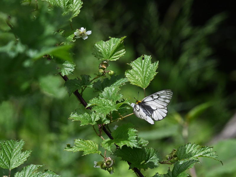 ウスバシロチョウ(ウスバアゲハ) クサイチゴ(?)の残り花で蜜を吸うオス。 集落全体を防鹿柵で広く囲んでいるため、その柵の中に生えるムラサキケマンは健在、 従って本種もかろうじて代をつないでいる。 【兵庫県東播磨:2025年5月19日撮影】 |