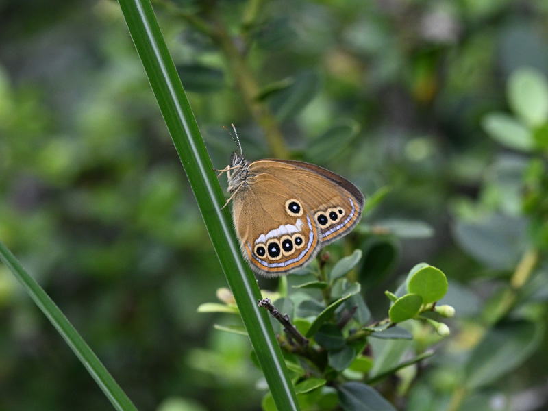ヒメヒカゲ ススキの葉にとまるメス。 当地で見られるメスの典型的な斑紋を持つ個体。 くれぐれも当地での採集はご遠慮ください! 【兵庫県東播磨:2025年5月30日撮影】 |
