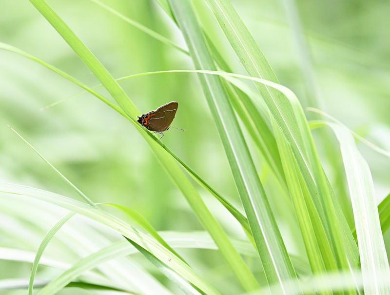 カラスシジミ ススキの葉にとまるオス。 早朝、ハルニレの高枝をたたくとヒラヒラと舞い降りたが、しばらくすると樹冠に舞い上がった。 【兵庫県但馬:2025年6月27日撮影】 |