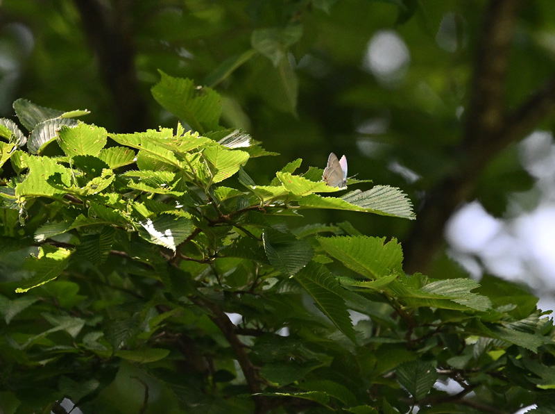 オオミドリシジミ 林道に張り出した枝先で占有行動中のオス。 数はそれほど多くはないが、この時期、尾根筋や山頂でテリを張る。 【兵庫県但馬:2025年6月27日撮影】 |
