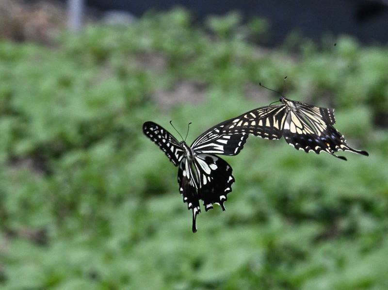 アゲハチョウ 求愛飛翔中のペア、左がオス、右がメス。 オスはメスの前方やや下を飛び求愛を示すが、交尾にいたることは少ないようだ。 【兵庫県東播磨:2025年7月31日撮影】 |