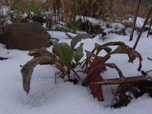 | 先月9日、皆で植えたオミナエシの苗も雪に埋もれ始めているが、しっかり根付いているようでひとまず安心。 | |