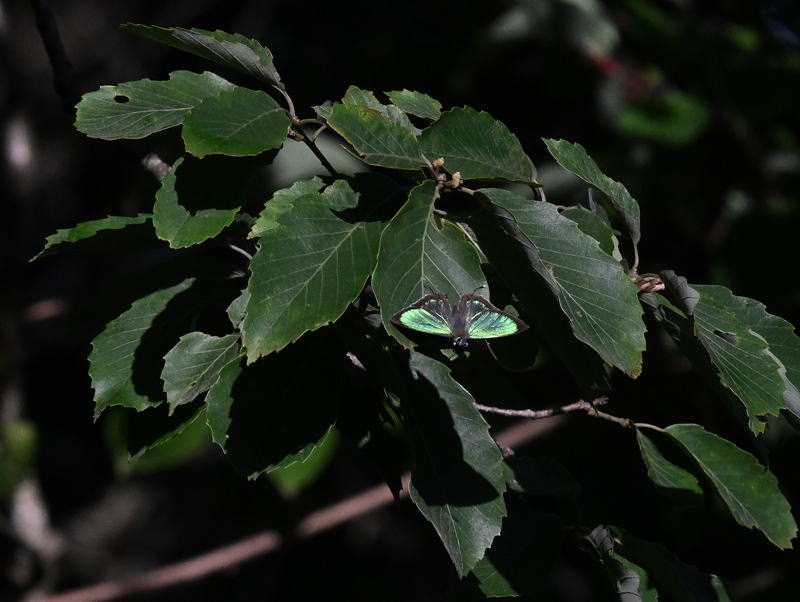 ジョウザンミドリシジミ Favonius taxila ヤマボウシの葉から飛び立ったオス。 ミズナラやブナが生える小さな沢、朝8時、本種とアイノミドリシジミが入り乱れて飛び交う。 2025年6月 兵庫県但馬 |