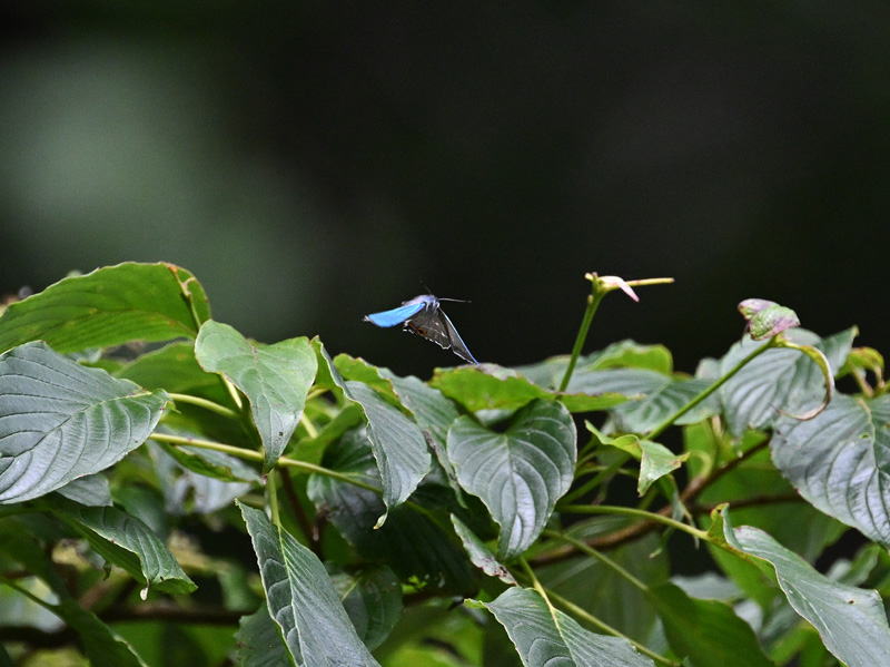 | ハヤシミドリシジミ Favonius ultramarinus 卍巴飛翔中のオス2頭。 午後5時半を過ぎるとカシワ林のあちこちで卍巴飛翔、追尾飛翔が見られるようになる。 静寂の中、青い銀紙がキラキラ輝き、美しいことこの上ない。 2025年7月 兵庫県但馬 |